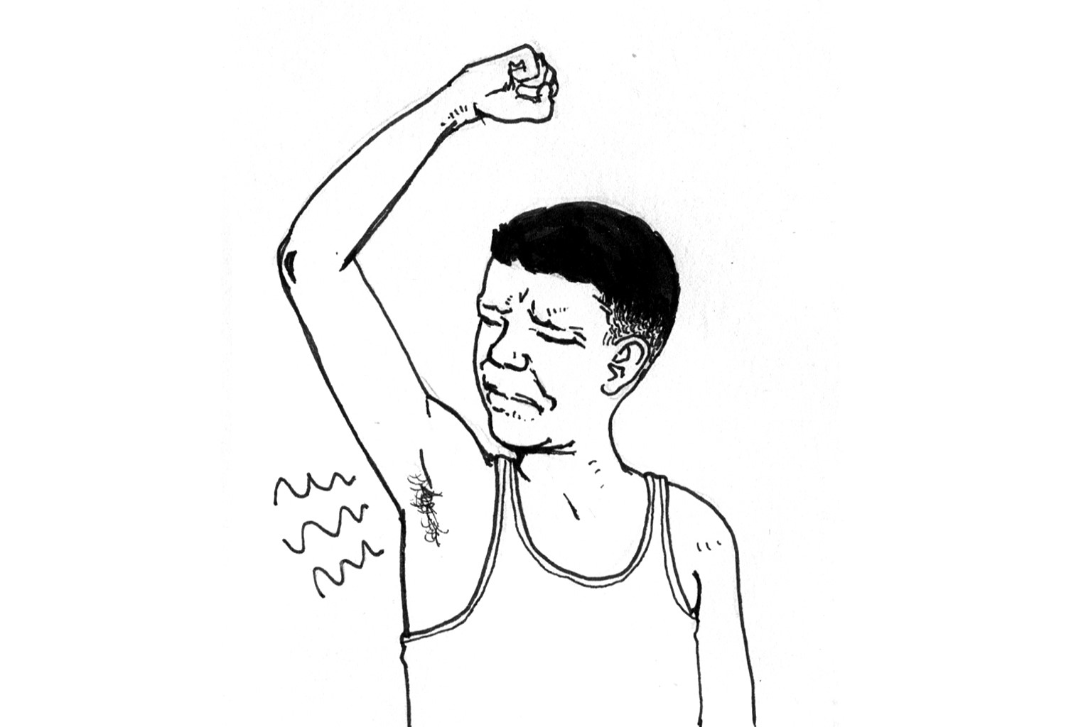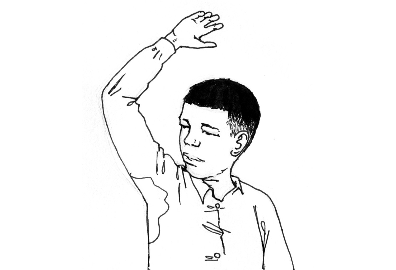 Застанете пред огледало и посочете го пределот на пазувите преку облека на Вашето дете/ученик/роднина/корисник. Доколку Вашето дете/ученик/роднина/корисник не го користи поимот пазуви, истиот заменете го со поим кој за него е познат (мишки, под рацете и сл.). Наведете дека тој предел може да биде мокар од потта. Натопете ја облеката кај пазувите за да ја почувствува промената, односно да го осети чувството на мокра облека на пазувите. Доколку Вашето дете/ученик/роднина/корисник се уште не го поминал тој развоен период, односно е пред пубертет, посочете или покажете слика од негова блиска машка личност, постара од него (татко, брат, родина, другар и сл.) која се поти на пазувите. Доколку сте во можност покажете пример на испотена облека на пазувите. Доколку не сте во можност натопете ја облеката кај пазувите за да ја почувствува промената, односно да го осети чувството на мокра облека на пазувите. Наведете дека и тој ќе се поти на пазувите и облеката на пазувите може да му биде мокра, како на личноста која ја посочувате како пример.