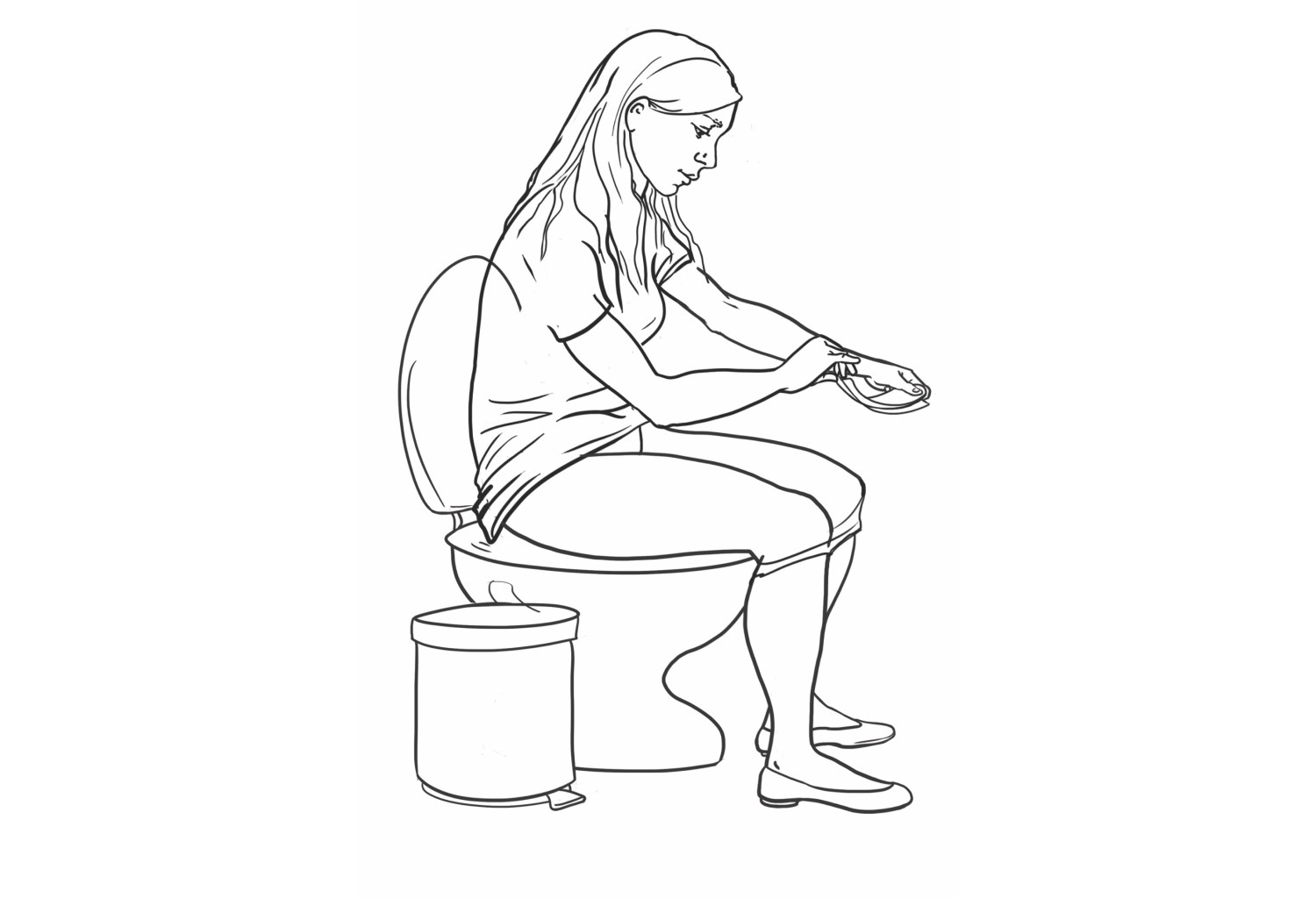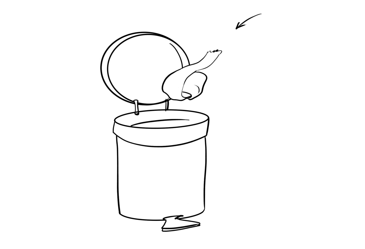 Нагласете дека е многу важно завитканата влошка да се фрла само во корпата за отпадоци. Согласно можностите на Вашата ќерка/ученичка/роднина/корисничка посочете дека во спротивно, доколку завитканата влошка ја фрли во шољата, таа ќе се затне. Доколку во WC нема корпа за отпадоци, тогаш посочете ја просторијата во која има корпа за отпадоци, во која може да ги фрли опаковката и хартијата (кујна, надвор пред влезна врата, двор и сл.). Користете модел за демонстрирање (завиткана влошка со обоена вода во тоалетна хартија) за да го претставите движењето, односно фрлањето на завитканата влошка во корпата за отпадоци. Демонстрирањето можете да го изведете Вие или на Вашата ќерка/ученичка/роднина/корисничка да примените техника рака врз рака, каде со Вашите раце ги движите рацете на Вашата ќерка/ученичка/роднина/корисничка за таа да ја изведе активноста. На овој начин го поттикнувате моторното учење кај Вашата ќерка/ученичка/роднина/корисничка.