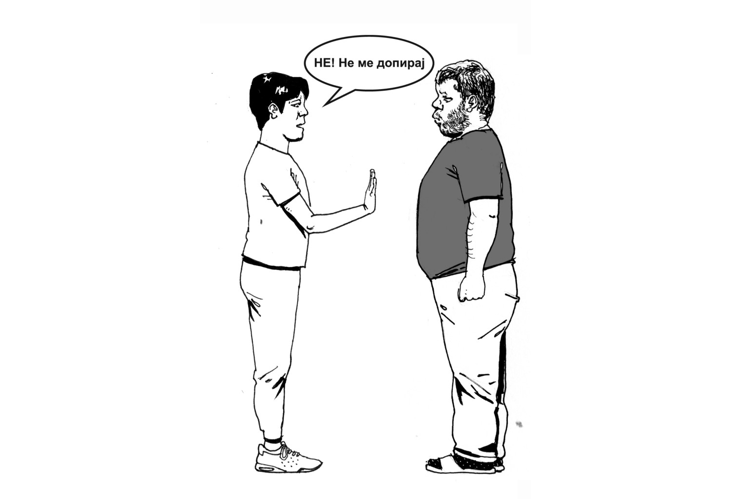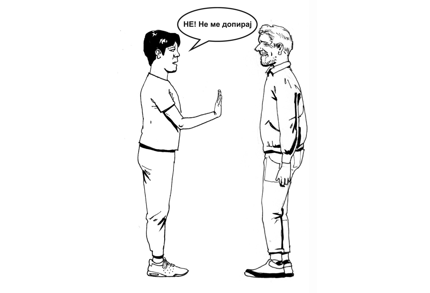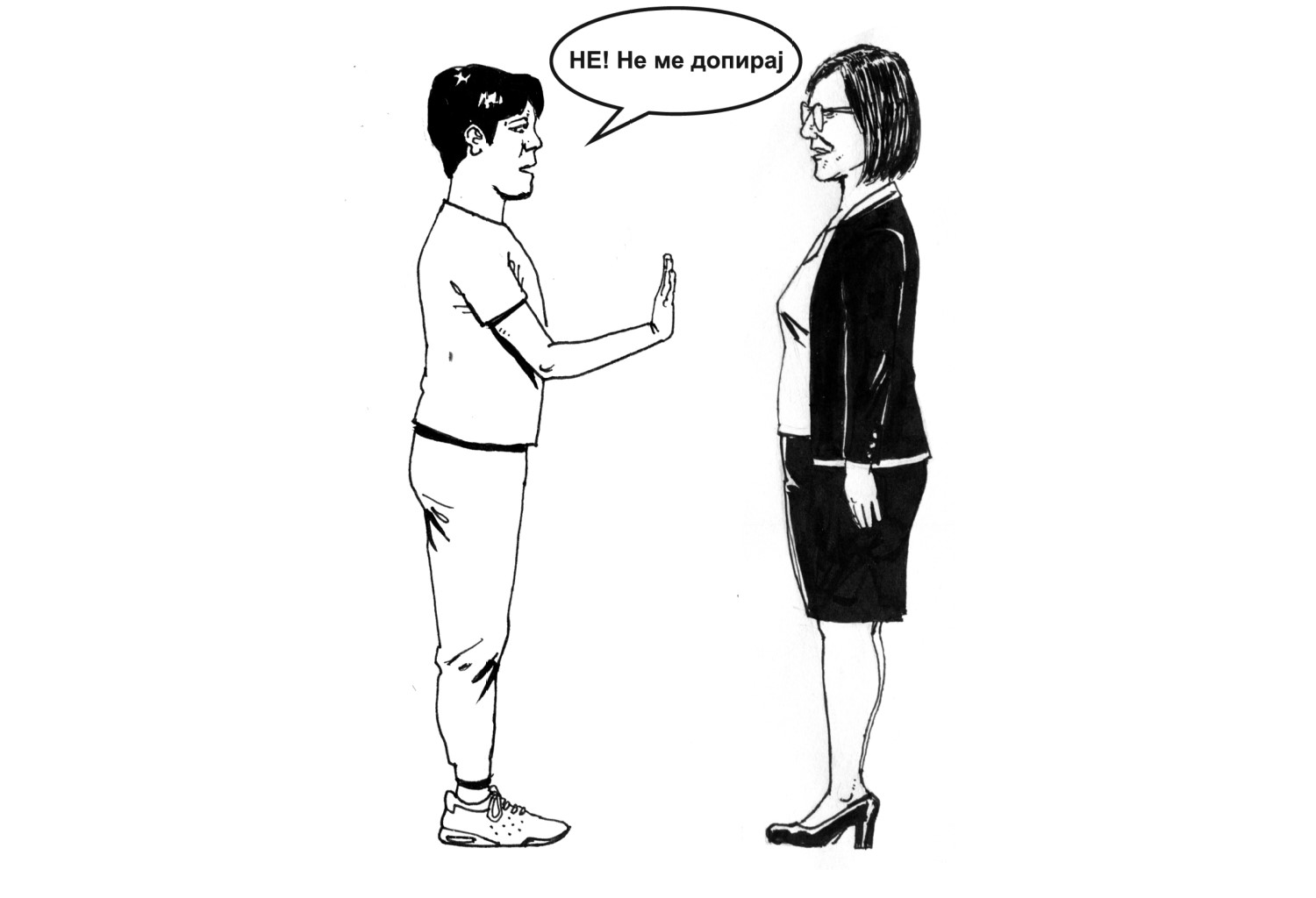 Некои допири некогаш ги доживуваме како пријатни, некогаш како непријатни. Во таа насока важно е да го охрабрите Вашето дете/ученик/роднина/корисник на непријатен допир да кажува „Не“ и да го искаже своето мислење, наместо да ги задоволува потребите на другите лица. Ликовите на илустрацијата именувајте ги согласно личностите, кои не се претставени во претходните ситуации, а се присутни во опкружување на Вашето дете/ученик/роднина/корисник.